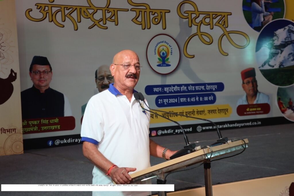 देहरादून। दसवें अन्तर्राष्ट्रीय योग दिवस के अवसर पर समस्त राज्य एवं जनपद देहरादून में अलग-अलग स्थानों पर कार्यक्रम आयेाजित किए गए। इस वर्ष इस वर्ष की थीम ‘योग स्वयम् तथा समाज के लिए है’ योग जहां स्वयं को मानसिक शारिरिक तथा आत्मिक रूप से बल देता है वहीं समाज को एकत्व के भाव का बोध कराता है। जनपद देहरादून में आयुष विभाग द्वारा बहुउद्देशीय भवन परेड ग्राउंड में आयोजित कार्यक्रम का मंत्री वन, तकनीकी शिक्षा, भाषा और निवार्चन, प्रभारी मंत्री जनपद देहरादून सुबोध उनियाल ने दीप प्रज्वलित कर कार्यक्रम का शुभारम्भ किया।