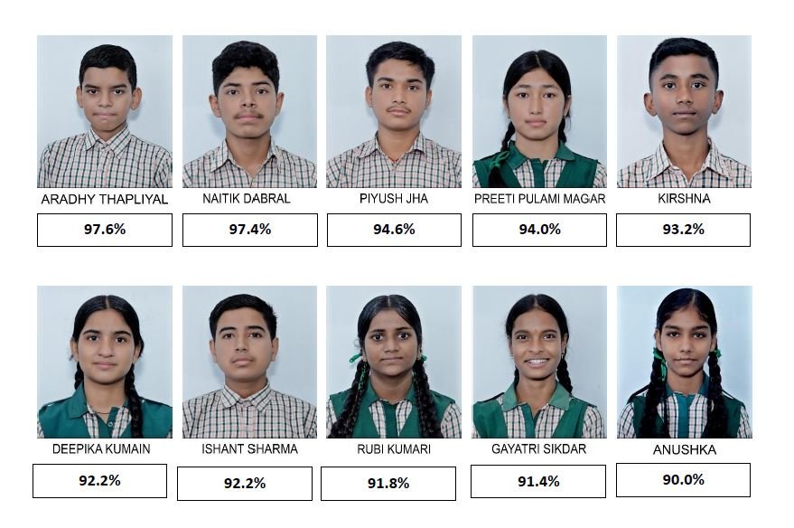 कक्षा 10वीं के परिणाम अत्यंत सराहनीय रहे। आराध्य थपलियाल ने 97.6% अंकों के साथ प्रथम स्थान प्राप्त किया, जबकि नैतिक डबराल ने 97.4% अंकों के साथ द्वितीय स्थान हासिल किया। पीयूष झा ने 94.6% अंकों के साथ तृतीय स्थान प्राप्त किया। परीति पुलामी ने 94% अंकों के साथ चतुर्थ तथा कृषणा ने 93.2% अंकों के साथ पंचम स्थान प्राप्त किया।